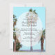 Handsome commitment ceremony invitation, with a photograph of palm trees and beach. A semi transparent oval text area has custom text ready to personalise for your special day.