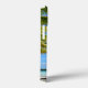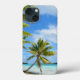 An iphone protection case with a hanging palm tree on a white sand beach of a tropical island in the Pacific Ocean belonging to the Tahiti archipelago French Polynesia.