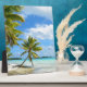 Plaque with a hanging palm tree on a white sand beach of a tropical island in the Pacific Ocean belonging to the Tahiti archipelago French Polynesia.