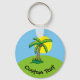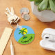 Cartoon illustration of a palm tree. Custom background colour. Custom text on both sides.