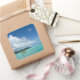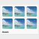 Square photo sticker of a small island with a palm tree in the turquoise lagoon of the tropical island Bora Bora near Tahiti in French Polynesia.