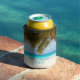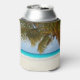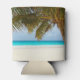 Tropical wedding custom drink coozie for a beer can, with big palm tree image at the sea. Beautiful turquoise water and nearly white beach sand is the backdrop for two lines of text.