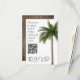 Palm tree, wedding QR code reply cards with tropical theme. One tall palm tree stands out over the white background on small, vertical cards. Create your own code to add to the template and make it simple for guests to reply to the wedding, showers or other large events. A short paragraph of text can be added to the left side asking guests to reply by a certain date. The back of the card has an image of palm tree bark.