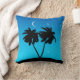 Throw pillow in a black silhouette of palm trees on a tropical island, against an evening blue gradient background with stars and crescent moon