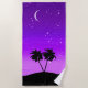 A black silhouette of palm trees against a twilight purple with a crescent moon and stars