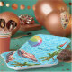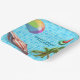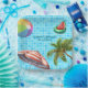 Hold an unforgettable pool party with this azure - light blue patio tile design that includes a palm tree, a beach ball, sun umbrella and fresh melon.
