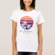 Customise this cute beachy tee with your town or city name in handwritten script, with the state beneath in modern sans serif. Design features a vintage style gradient sunset with palm tree silhouettes overlaid.