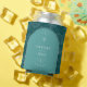 White line art palm leaf pattern over teal background. White palm tree illustration and text over arch.