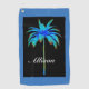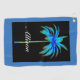 Palm Tree Tropical Colourful Blue Personalised golf towel is a unique design in colours of turquoise blue and black. The palm tree has bright royal blue added on a black background to show the beautiful colours and an elegant script name centred on lower area of the towel.