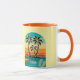 This colourful beachy coffee mug has a retro look with a stylised graphic design of palm trees curved and framed against an arch of sunset and sky colours in stripes of popular teal, gold, orange, and red. The palm trees set atop teal distressed beach wood, with a beach sign and flip flops in front of it. Your monogram initials appear in a gold colour so make sure to edit the placeholders in the Personalised section. The mug background - all but the handle area - is in a pale yellow, and the option shown here includes a dark orange "sunset coloured" handle and cup inside. Other mug and stein options are available.