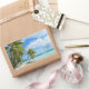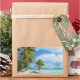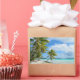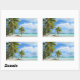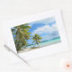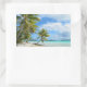 Rectangular photo sticker with a hanging palm tree on a white sand beach of a tropical island in the Pacific Ocean belonging to the Tahiti archipelago French Polynesia.