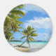 Round souvenir photo magnet with a hanging palm tree on a white sand beach of a tropical island in the Pacific Ocean belonging to the Tahiti archipelago French Polynesia.