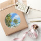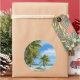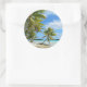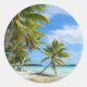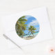 Round photo sticker with a hanging palm tree on a white sand beach of a tropical island in the Pacific Ocean belonging to the Tahiti archipelago French Polynesia.