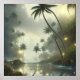 Beautiful palm trees and ocean at dusk with pretty lights.