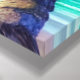 The image on the stretched canvas print displays a view of the ocean, sand, and sky, featuring varying shades of blue with white and blue clouds in the background. As you look closer, you will notice other colours peeking through, such as yellow and purple, creating a unique and mesmerising scene.