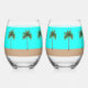 Palm trees wine glasses with custom text. "Meet me at the beach" is the sample text written across the bottom of the design. Tall palm trees over aqua blue are set in tan "sand" and the design wraps around the glasses. Perfect for drinks with a beach view. Buy a single glass or sets of two or four.