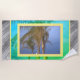 Tropical hot summer days. Yellow pink frame of three palm trees with fronds blowing in the ocean breeze with pretty blue sky. Background has tiled blue green hues. Sides of towel has wooden deck boards. Cool for male or female who loves the beaches and boardwalks. Personalise with a name, town, monogram. Buy in bulk and save. Original Photography and Design © TamiraZDesigns.