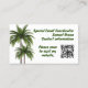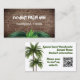 Tropical themed, palm trees business cards with QR code template. Double sided cards have palm tree bark background on the front with two lines of text. Use for business name, or personal name with occupation. On the back, add more text and QR code, or logo, or small image / photo. Two palm tree images decorate the white background. Fonts are modern and playful, or change them as you choose.
