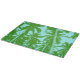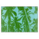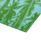 Bold decoration of palm trees in a posterised style. Green with a light blue background.