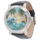 A vibrant wall clock design featuring tropical elements including palm trees, jumping dolphins, and a serene ocean sunset scene, evoking summer, nature, and marine vibes for your home decor.