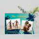 Looking for beach themed Christmas cards to send to family and friends? This stunning holiday photo card features a painting of palm trees as the background, as well as 2 photo templates. Stylish typography reads, "Mele Kallikimaka" in real foil, and the photos are framed in foil, as well. Easy to personalise! The back contains a sand design over a white background.
