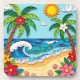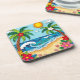 A coastal Coaster in a paper quilling style ai illustration of two palm trees, the sun, ocean waves, a beach and tropical flowers.