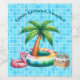 Hold an unforgettable pool party with this azure - light blue patio tile design that includes a palm tree, a cute flamingo and some cold refreshing drinks by the pool.