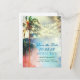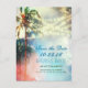 Romantic vintage save the date with rustic old palm trees, watercolor ombre blue coral background and dreamy string lights. Perfect save the date postcard for destination and beach weddings.