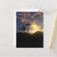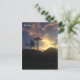 This postcard shows a beautiful photo of a south Florida sunset emerging from behind the tall palm trees and landscape. The sky is lit up with radiant colours of blue, pink, grey, and yellow.