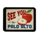 A charming Palo Alto California vintage travel wall refrigerator magnet featuring a lovely red apple, along with fun retro style text that says, "See you in Palo Alto"