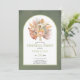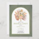 Tropical dried palm leaves, pampas grass and protea flowers sage green arch wedding rehearsal dinner invitation. This lovely wedding design features an arch frame on sage green stained background. In the frame there is a watercolor bouquet of dried palm leaves, protea flowers and pampas grass.