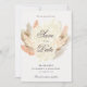 The wording "save the date" is written in an elegant earthy brown script font. Beneath the names, the date, and the location of the wedding in a classy all-caps serif font. Add one of your favourite engagement pictures to the back of the card outlined by a classy arch frame