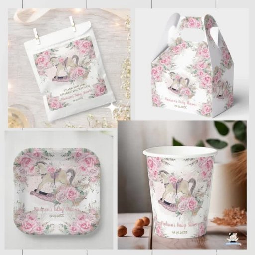 Personalise these whimsical paper napkins easily and quickly, simply press the customise it button to further re-arrange and format the style and placement of the text. Featuring a whimsical vintage wooden rocking horse, pretty pink roses and earthy tone pampas grass. Great for baby shower, new baby, birthday party and more occasions! Matching items available in store! (c) The Happy Cat Studio