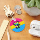 A keychain featuring a panda in pansexual/ panromantic pride flag colours (pink, yellow, and teal) with the pan flag as a background.