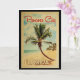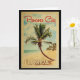 A uniquely retro mid-century modern Panama City Florida art print in vintage travel poster style. It features a curved palm tree on sandy beach with ocean under a blue cloudy sky.