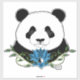 Portrait of a cute panda bear with a blue lotus flower in a backdrop of green