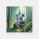 A panda wearing a colourful party hat reads a birthday card while sitting in a lush bamboo forest