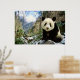 A Panda in the mountain.has a black and white panda sitting with with a forest view behind him and a trees around them and snow on the ground.this is a beautiful photo.