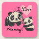 A mummy and baby panda bear design with a pink background and text and white hearts and text that reads I Love Mummy on T-shirts, bodysuits, mugs, cards, stickers, bags, magnets, and more.