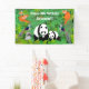 Beautiful lush green bamboo forest tapestry with black and white pandas, red pandas, and colourful Lady Amherst's pheasants banner for an animal themed child’s birthday party. Customise the text.