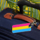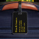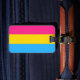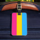 Luggage tag with the pansexual pride flag, yellow name and address information on a black background. Personalise with your name and address information using the easy templates. Font colour, font style, font size, and background colour are customisable. The perfect colours for travel.