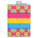 Vinyl-wrapped flask with the pansexuality pride flag and a seamless modern geometric flower pattern in the colours of the pride flag; a pink, yellow and blue pan pride design on a pink background with an editable text template for your name or message
