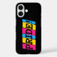 Phone case for Apple iPhone 16 with text in the colours of the pansexuality pride flag. Pink, yellow, and blue flag of the pan pride movement on a black background
