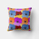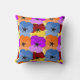 This throw pillow has a Spring design of purple, blue, orange, and red with yellow pansies layered on each other on a field of yellow.