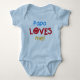 Papa Loves Me T-shirts, long sleeve tees, raglan T-shirts, bodysuits, football bodysuits, tutu bodysuits, organic bodysuits, sleeveless dresses, ruffle shirts, ruffle dresses, hats, dark T-shirts, sweatshirts, pullover hoodies, and more for kids, toddlers, and babies with red, blue, and gold text and heart design that reads Papa Loves Me!