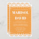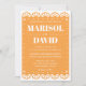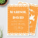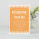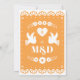A beautiful papel picado style wedding invitation on a festive orange background. The back features a dove design with the couple's initials. Perfect for a traditional or modern Mexican wedding.