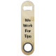 We Work For Tips is the text or substitute I Work For Tips and repeats on the back. Any wording can be deleted or changed. The background has a brown and tan paper faux texture, like a cardboard box style design. Basic and unique. Great for any bartender, tailgating or personal use, and distinctive to set yours apart from others.