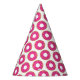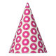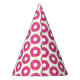 Paper Birthday party hats with pink doughnut print. Fun colourful cone hats. Cute design for themed Birthday party.