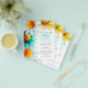 A great value PAPER (not card) alternative WITHOUT ENVELOPES at SMALLER size 4.5” x 5.6” and at a budget price. (Standard A6 envelopes are the nearest size to fit) Paper Boho Wildflower Thank You Birth Announcement. A stylish informal set script for the header. You can easily personalise the text to your own requirements and change the text style, colours and background colours if you wish via the edit further option. Large florals in shades of turquoise, yellow and white daisies decorate the left hand side.