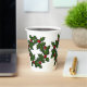 Wreath of green holly branches with red berries. Three wreaths around the cup.